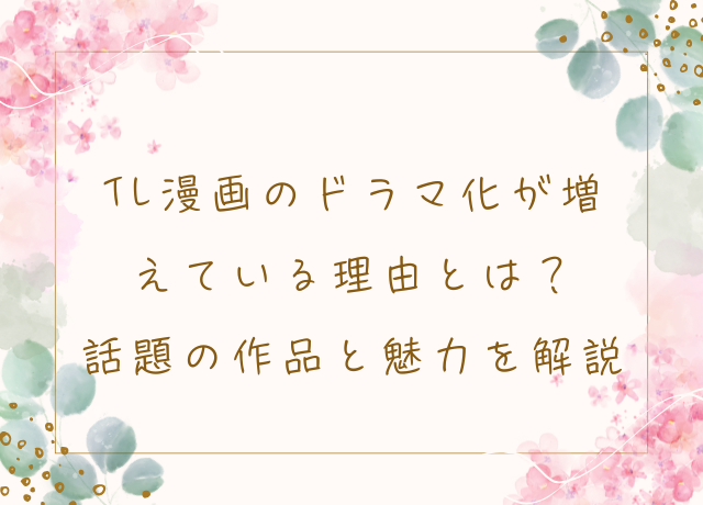 こうした人気背景に、TL漫画原作した実写ドラマ次々に制作れ、SNSでも話題なること多くなりした。この記事では、TL漫画ドラマ増えいる理由代表作品、人気秘密について解説ます。